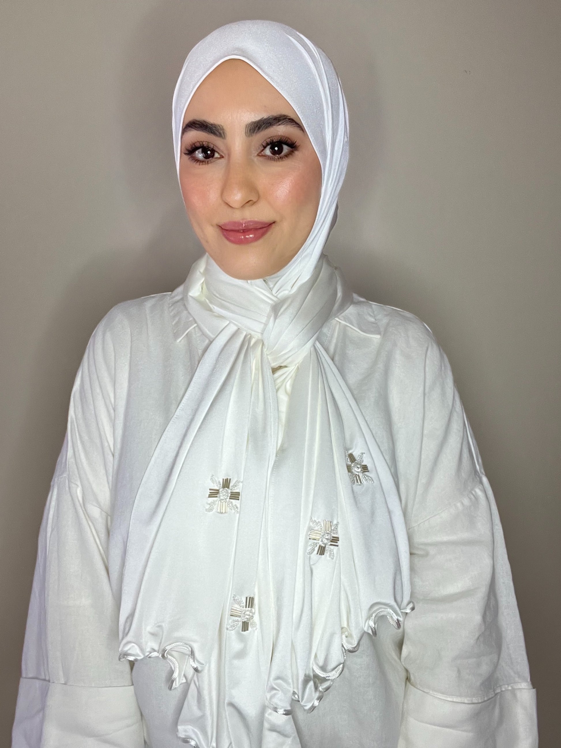 Sublimez votre style avec notre hijab princess en jersey satin, magnifiquement brodé de perles à la main. Ce hijab combine la douceur et l'élasticité du jersey avec l'éclat raffiné du satin pour un rendu luxueux et confortable. Chaque perle est minutieusement appliquée à la main, ajoutant une touche d'élégance et de sophistication à ce modèle unique.